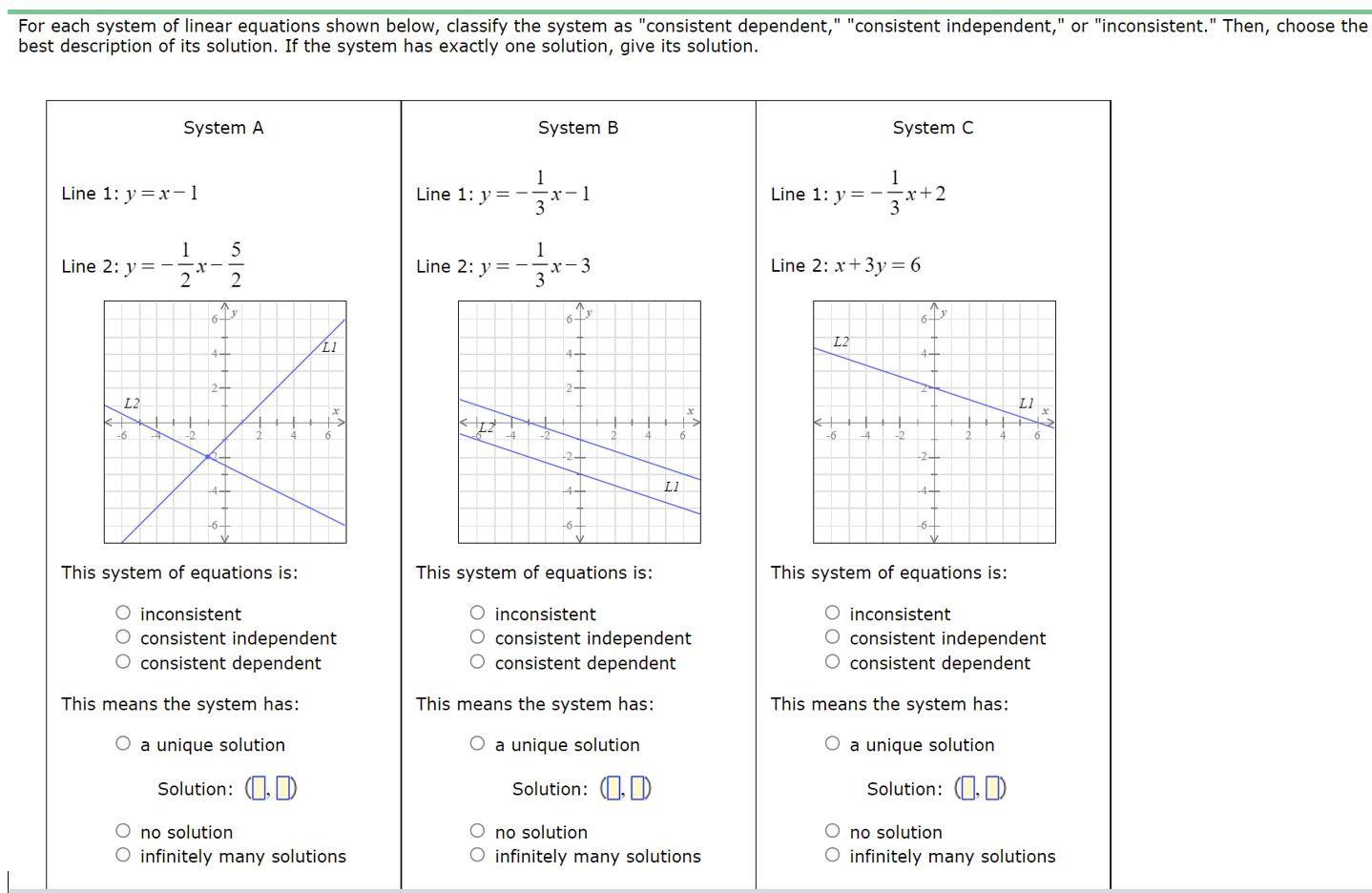 O When a system has one solution the graphs of the equations intersect once the system is a consistent system of linear equations and the equations are independent. Will have the same value of m but different values of. And before I tackle this specific problem lets just do a little bit a review of what dependent or independent means.
