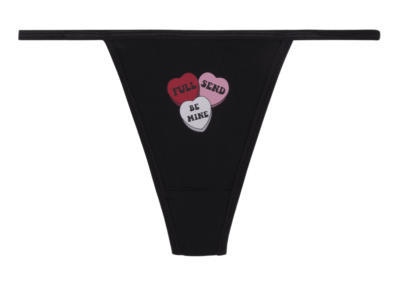 Heart thong. Give your lingerie collection a romantic touch with this red heart thong. Features our signature Skull Bones logo embroidered on the back. Product Details Care Guide.